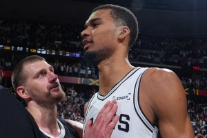 “约基奇完全领悟了篮球的真谛。我相信文班亚马也能展现出同样的能量。这孩子非常聪明,他总是观察局势并迅速做出调整。你很难用假动作骗过他,如果他被你的投篮假动作骗过一次,他马上就会调整。下次你再用这招,就不好使了。他盖帽时也不会拼命把球扇飞到看台上去,他就是轻轻把球拨走。”